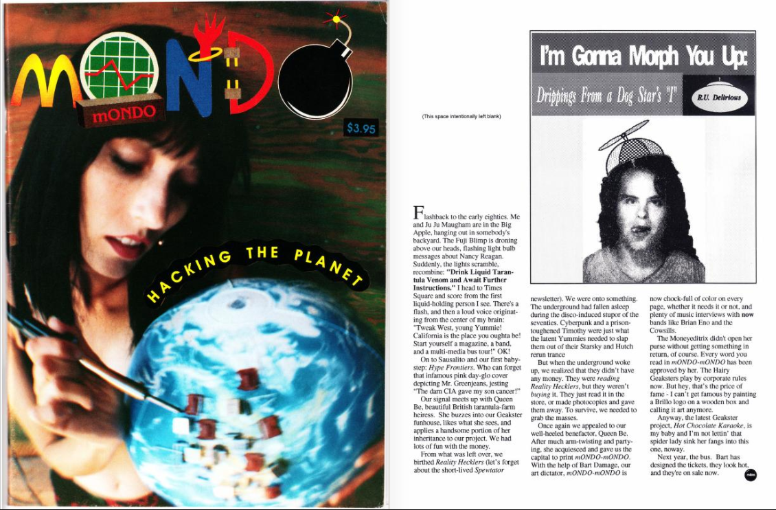 Cover and first page of the mONDO mONDO parody in bOING bOING issue 9 (1992). Read the whole issue here.