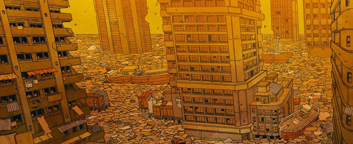 More than any others, one work deserves the qualifier of “post-cyberpunk”: Carbon & Silicon, from awarded French author Mathieu Bablet. However, the label itself has no importance, as this new entry in a genre that has found itself rooted in the past has one merit that stands out among its peers: it debunks the theory that “there’s no way to make science fiction today”. When I read Shangri-La, a surprise phenomenon in French comics from Editions Ankama that made the scene in 2016, I was awestruck by its explosive graphic style and its radical political point potentiated by an organic and sensitive relationship to fiction. The exploitation of life (animal, human) and the impossibility of a revolt leaves the reader with a terrifying observation on the human condition as beholden to an improbable inheritance. Therefore, it was a great honor and pleasure to host the Carbon & Silicon launch event with Mathieu Bablet in August 2020 at Le Mans. Even though I jumped vigorously onto the hype train, I was still floored by its indirect (but just as incredible) sequel, which tells the story of two wandering androids on Earth spanning 300 years. Since there’s been a successful Kickstarter campaign from Neurobellum Production to launch both Shangri-La and Carbon & Silicon in the US, let’s have a closer look at the latter. Collapsodroïds It all starts with a statement of failure. Humanity at the height of its power (“very unequally distributed” as William Gibson would put it) creates two strong artificial intelligences, Carbon and Silicon, prototypes and the first representatives of a long series of robots intended to “flood the care market”. Funded by investments from the retirement home sector, the Tomorrow Foundation makes this great intellectual leap typical of late capitalism: dedicating the most cutting-edge of technology to overcoming humanity’s empathy deficit. Taking care of the elderly is not profitable, unlike selling them overpriced robots. Obsolescence is scheduled after 15 years (“like a cat”) allowing the market to be renewed. The timeless cyberpunk motto “high-tech, low life” has its first occurrence in a long series. The two Carbon and Silicon droids are thus born of empathic failings, mercantile weaknesses of humanity and the demiurgic dream of Noriko, their neurotic workaholic designer. She, who has a presentiment of a world on the edge of collapse, places all her hopes in her creations, which she imagines will be emancipated from the psychosocial legacies inherent in all education. Detached from parentage, robots would be freer. She neglects her own daughter due to this, considering her androids as necessarily more “perfect”. The little girl does not appreciate this. Created for these “wrong reasons” the two twin robots will try to make sense of their life, one (Silicon) through travel, solitude and the discovery and preservation of a body identity of its own; the other (Carbon) by forging links with others, through a sedentary lifestyle, commitment and constant reinvention. Although designed exactly the same, they have different experiences and their distinct life paths lead them to develop quite unique personalities all while the world crumbles around them. The book sketches, without going into the details of the causes and consequences, a collapsing backdrop as the years go by. Northern societies, at the height of consumption, high-tech, and inequality, crumble and ignite, collapse, disappear… reconfigure themselves. Corporations become sects, robots emancipate themselves and become a new form of life, slums grow as far as the eye can see and life tirelessly goes on. Carbon will see in it an eternal pattern of violence and domination, consubstantial with human nature because it is subject to “ego and the inability to think outside of oneself”. Humanity’s failures are everywhere, revealing head-on the author’s dejected, brutally honest observations of the violence of the world. Humanity, in fact, accumulates errors and violence that (almost) not an ounce of benevolence or solidarity catch up with throughout the book. Beauty is there, it’s true, in the world and its landscapes, in the intoxication of simply being alive and in the unique relationship between Carbon and Silicon, in eons of romantic clichés about love, brotherhood or friendship. Yet this beauty struggles to catch up with the violence of the repeated and unsurpassable failures of humanity. And the explicit reference to little Alan Kurdi, a Syrian Kurdish refugee who died on a Turkish beach at the age of three and whose photo had traveled around the world without causing any change in the European policies for welcoming refugees, the highlight of collective moral bankruptcy. Post-humanism For Carbon and Silicon, life itself is to be reinvented without a model to follow. Humanity is no longer the pinnacle of sensitivity and intelligence that robots should strive for. The classics of robotic sci-fi, Ghost in the Shell, Blade Runner, Asimov… are overwritten by Mathieu Bablet’s post-humanism. Nothing will come to save humans, prisoners of their desires encased in a facade of rationality. Humanity is not a horizon to be reached, it is exceeded from the first boxes (“you already know how you’re going to end up, right?”). It is an outdated, dysfunctional model whose pseudo-intelligence (“a stupid question of not having enough neurons”) has nothing to offer. From then on, the worlds are fragmented in time jumps of fifteen years (the duration of each robotic generation, changing colors according to a process, cyclical, entropy / reconstruction …). Jumps during which Carbon and Silicon ultimately seem less looking for something to live for. Left to their own devices in the existential quagmire, they are reminiscent of Grave of the Fireflies (火 垂 る の 墓, Isao Takahata, 1988) where two children watch over each other in the chaos of the collapsing world. 